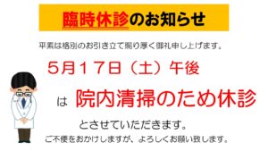 2025.05.07 5月17日(土)の午後は院内清掃のため休診とさせていただきます。 ご不便・ご迷惑をおかけしますが、何卒ご理解頂きますよう宜しくお願い申し上げます。 << 次の記事 一覧に戻る 前の記事 >>