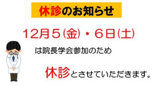 2025.12.03 12月5日(金)・6日(土)は院長学会参加のため、休診とさせていただきます。 ご不便・ご迷惑をおかけしますが、何卒ご理解頂きますよう宜しくお願い申し上げます。 一覧に戻る 前の記事 >>