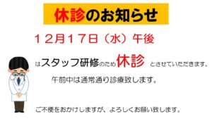 2025.12.16 12月17日(水)午後はスタッフ研修のため、休診とさせていただきます。 午前中は通常通り診療をしております。 ご不便・ご迷惑をおかけしますが、何卒ご理解頂きますよう宜しくお願い申し上げます。 一覧に戻る 前の記事 >>
