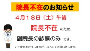 2026.03.30 4月18日(土)の午後は院長は不在です。 副院長のみの診察となります。また、リハビリテーションは通常通り行います。 ご不便・ご迷惑をおかけしますが、何卒ご理解頂きますよう宜しくお願い申し上げます。 一覧に戻る 前の記事 >>