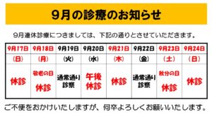 2023.09.02 9月第3週は日・祝日の休みに加え、20日(水)午後は休診とさせていただきます。 ご不便・ご迷惑をおかけしますが、何卒ご理解頂きますよう宜しくお願い申し上げます。 << 次の記事 一覧に戻る 前の記事 >>